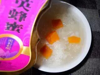5,煮好的糯米粥,稍稍燜一會;盛入碗中,加入適量蜂蜜,拌勻食用。