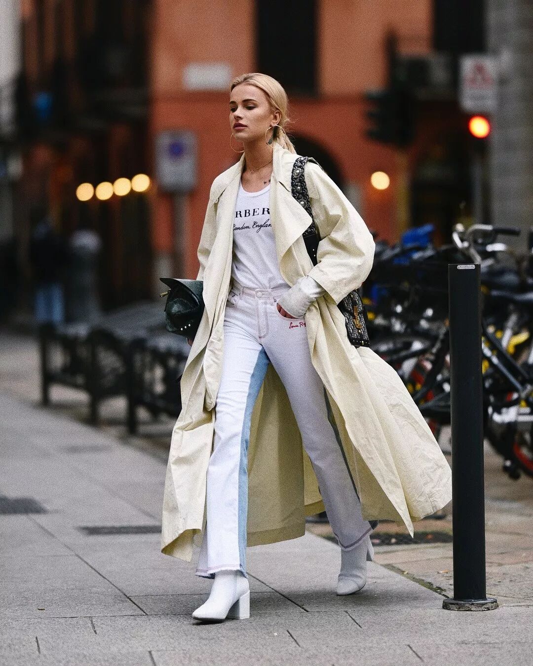牛仔褲這位萬能選手真的是哪里也不能少了它,風衣的大地色系與牛仔藍穿在一起也是蠻好看的。尤其是帶有復古做舊感的牛仔褲,與風衣搭配起來更是時髦又有型,再穿上一雙短靴,范范秋天就打算這樣穿~。