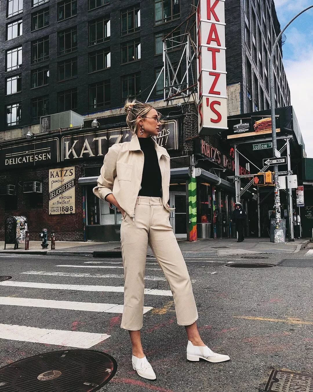 腿型不好或腿有點粗的女生可以選擇闊腿褲,看起來比較顯瘦。當夾克和褲子都是淺色系的時候,內搭就可以選擇黑色。