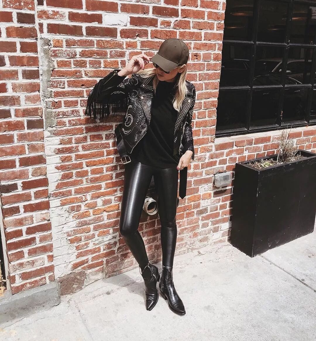 一身黑的造型可以很酷,特別是廓形皮夾克+黑T+黑色窄腳褲(不過建議不要像下圖這樣輕易挑戰皮褲哈)+尖頭短靴的造型簡單經典,時髦又實用,還顯腿長。