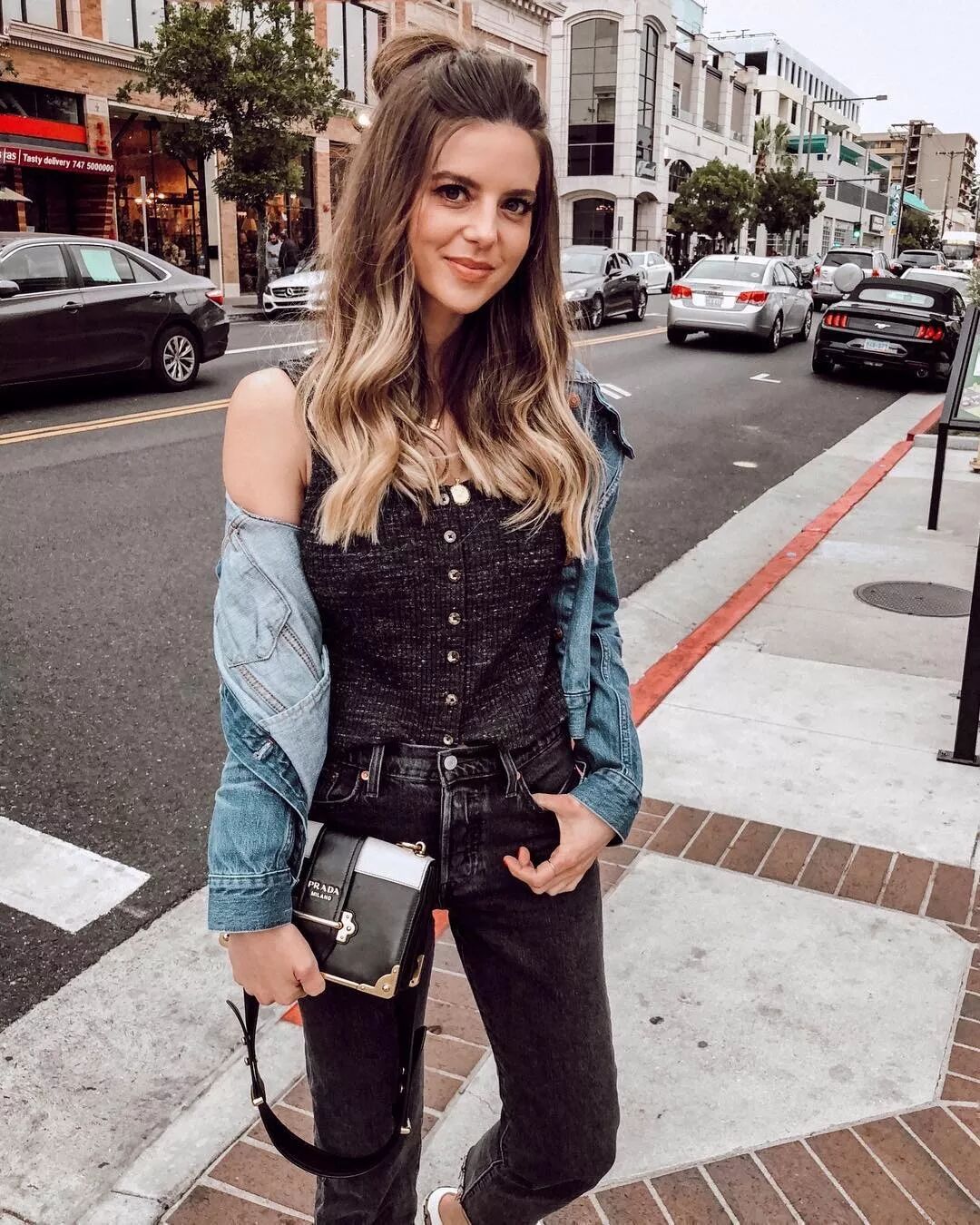 牛仔外套搭配黑色吊帶+黑色牛仔褲,雖然顏色比較深,但是給人的感覺明朗帥氣,手上的黑金包包和脖子上的硬幣式圓片項鏈也十分出彩。