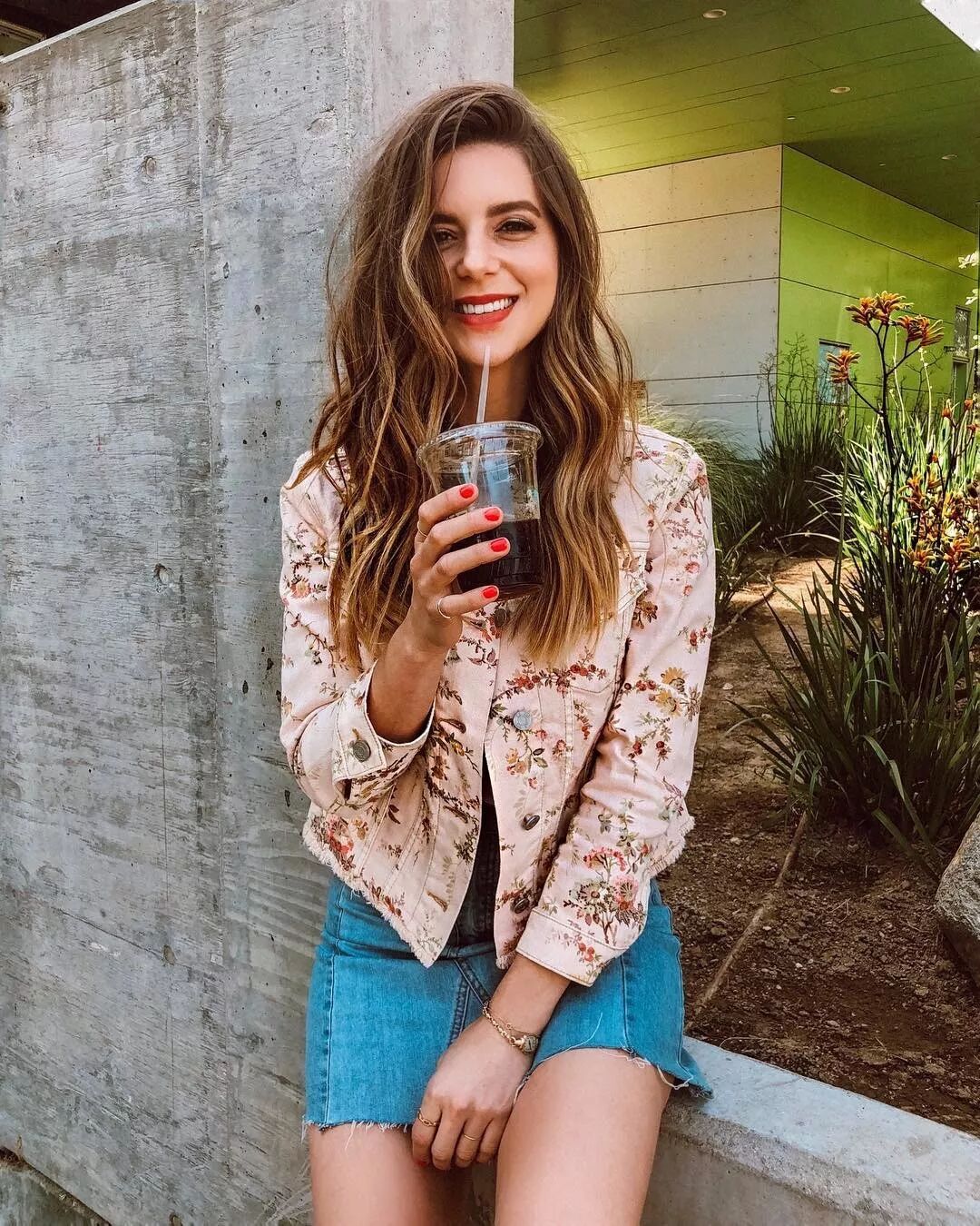 不過范范最喜歡的還是用牛仔外套來搭配設計感的花色半裙,半裙給相對比較單調的牛仔添加了更chic的時髦元素。