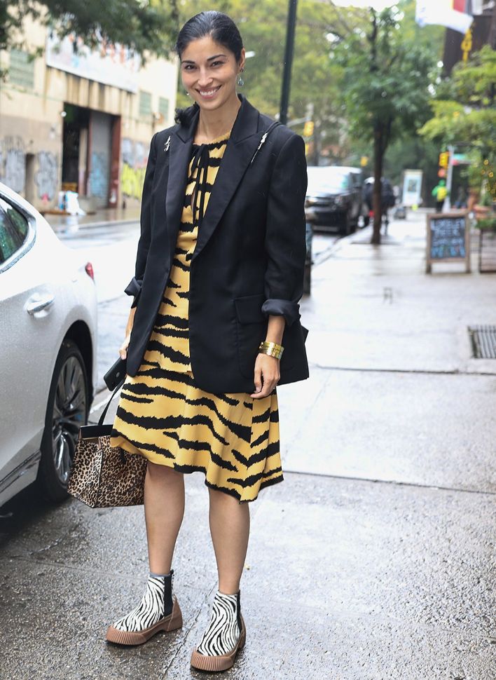格紋連衣裙搭配黑色的BF風夾克,有一種濃濃的高街范,腳踩一雙時髦的尖頭平底短靴,格紋裙削弱了黑色夾克的暗沉,利落又顯精氣神。