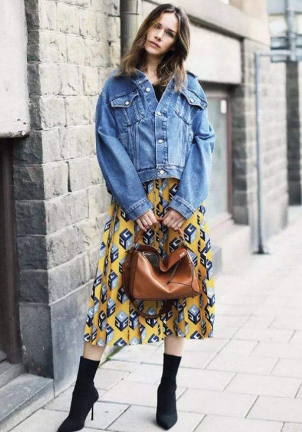 牛仔外套+裙子的搭配也是超有架式兒的,和搭配A字裙既青春又街頭,還可以修飾腰部和臀部的曲線,看起來更加迷人。