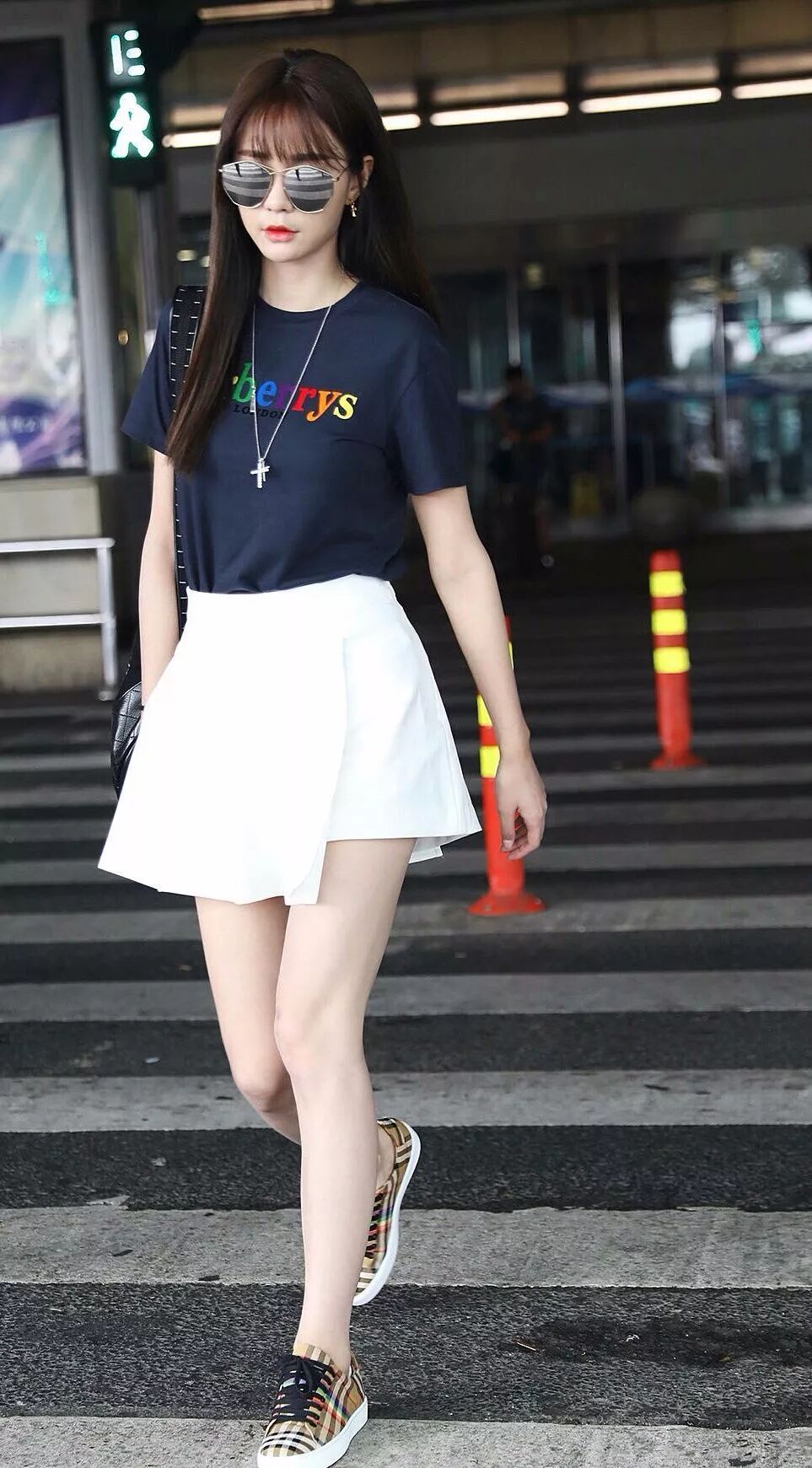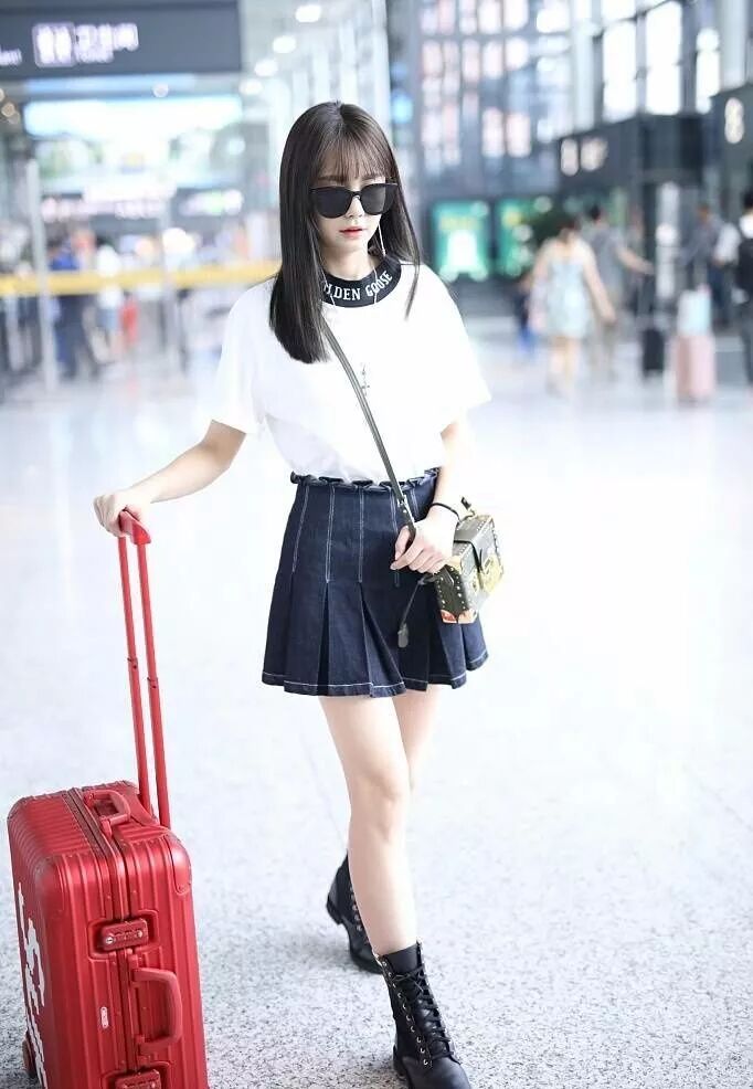 白色的短袖搭配黑色的百褶裙是比較常見的搭配,但是很適合沈夢辰,搭配黑色的靴子特別的帥,一般直接搭配個帆布鞋也是可以的
