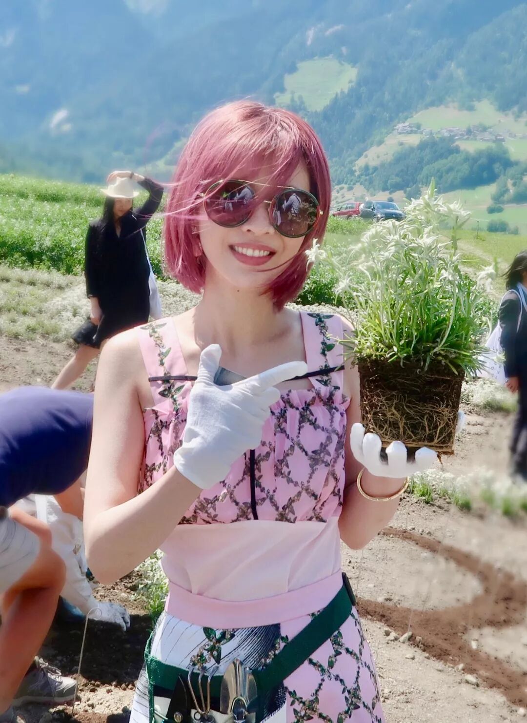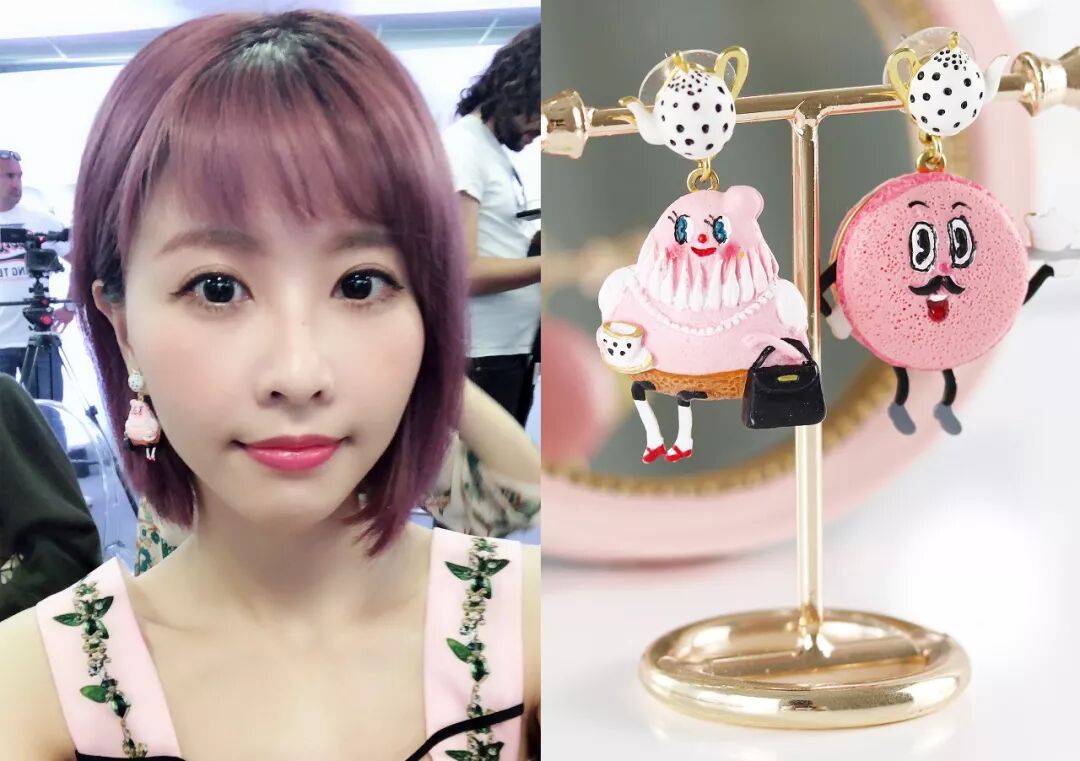粉色的頭毛,粉色的Les Nereides馬卡龍茶壺耳環,粉色的FABIANA C套裙。