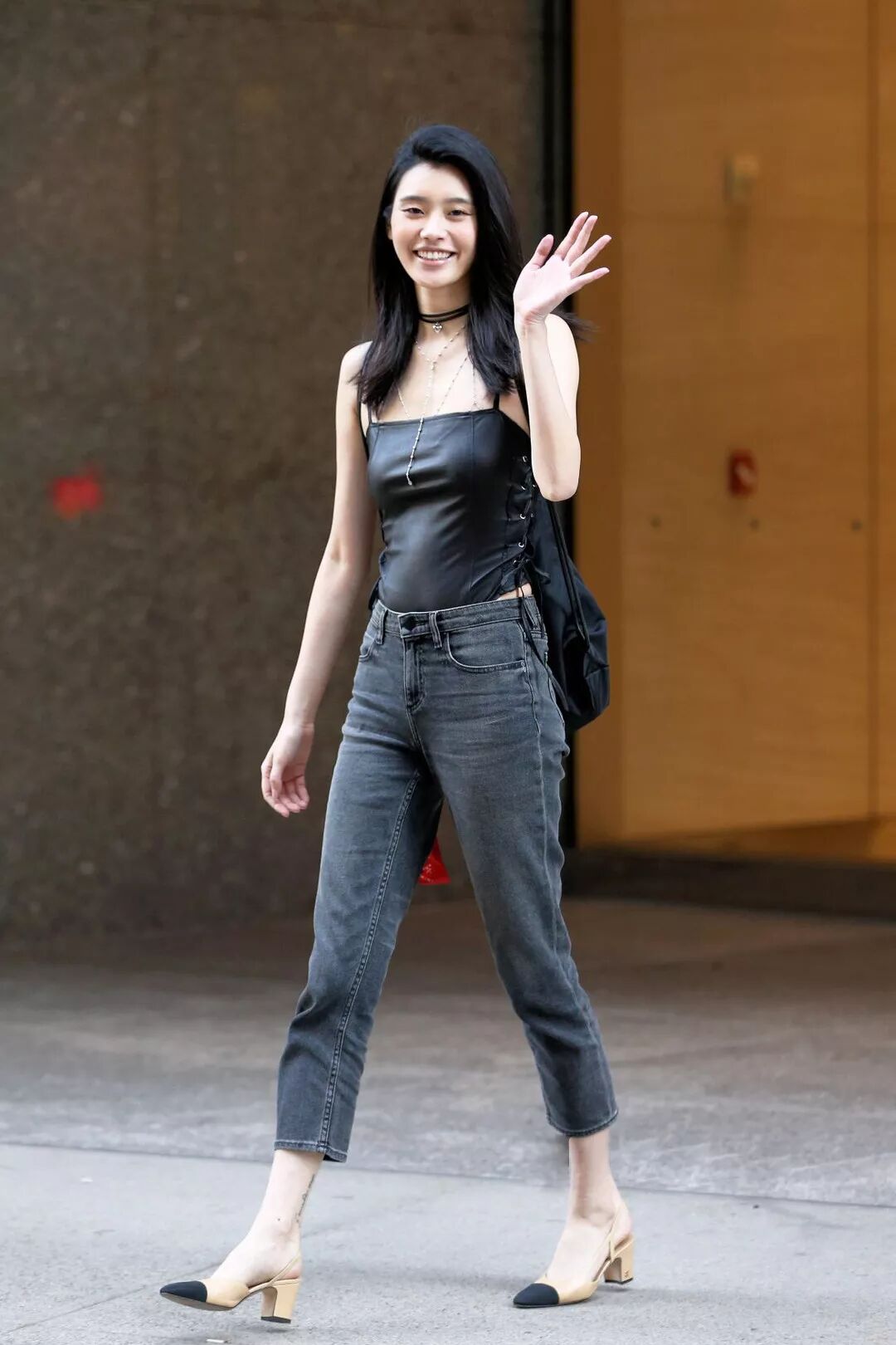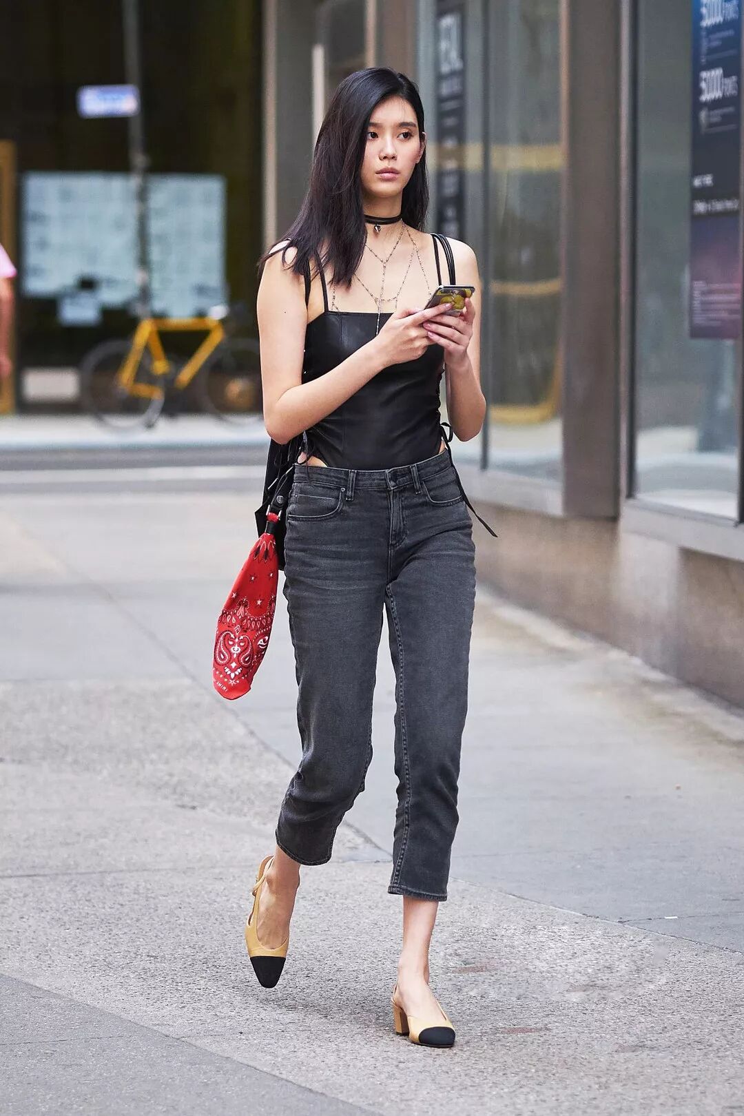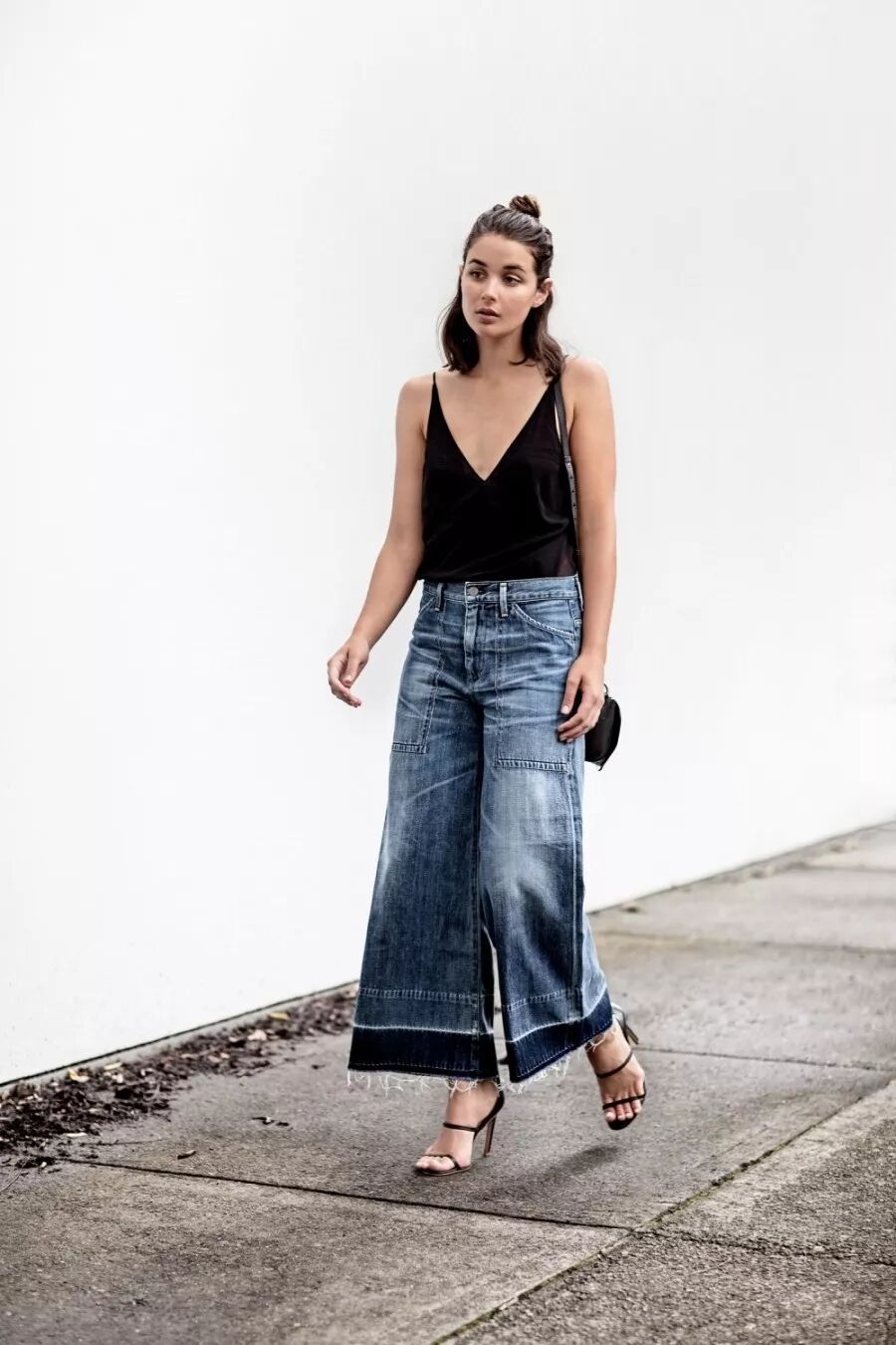 緊身牛仔褲對姑娘的腿型要求比較高,腿粗、腿型不直的姑娘建議選擇牛仔可闊腿褲 + 吊帶上衣 或者 牛仔直筒褲 + 吊帶上衣。