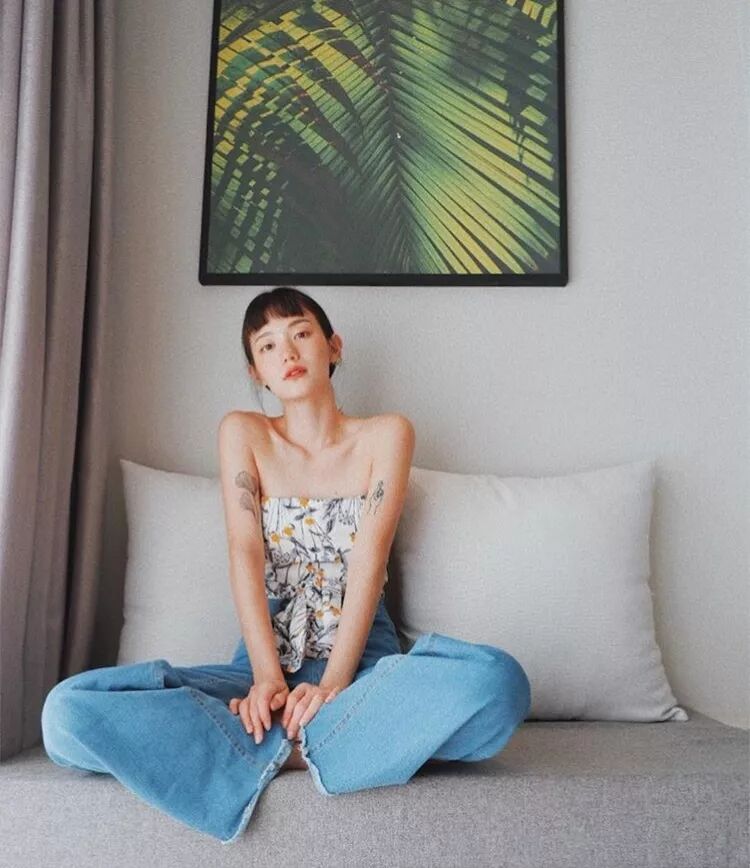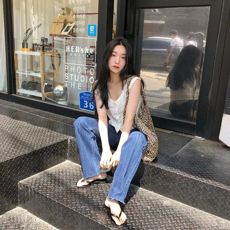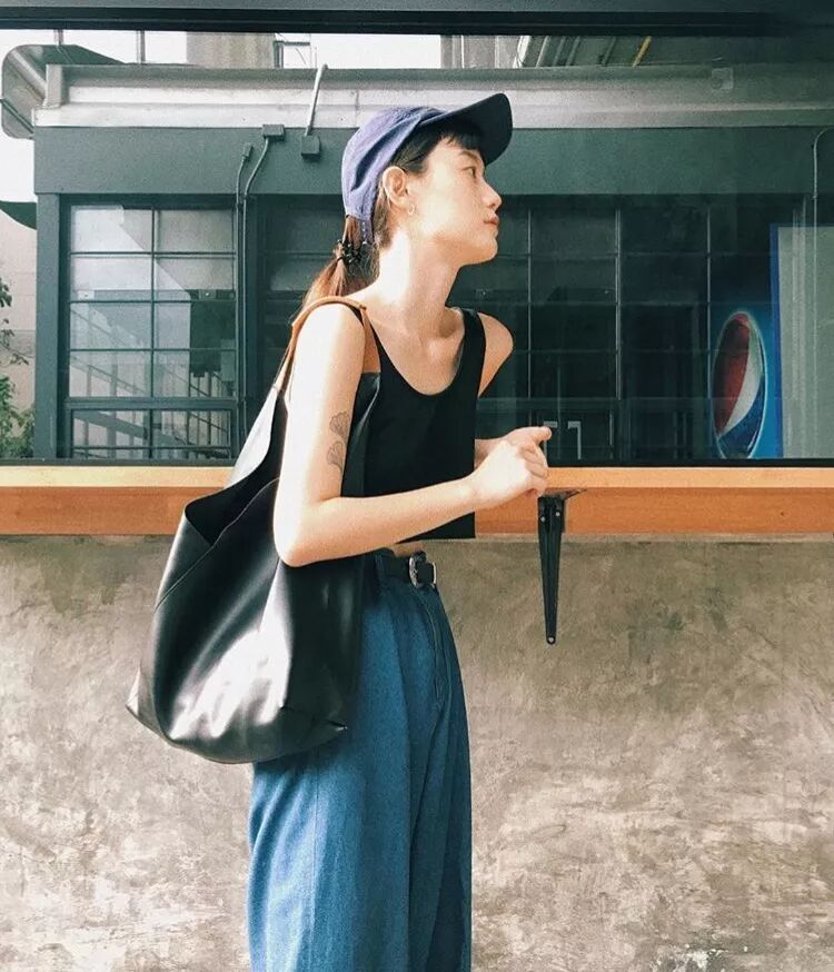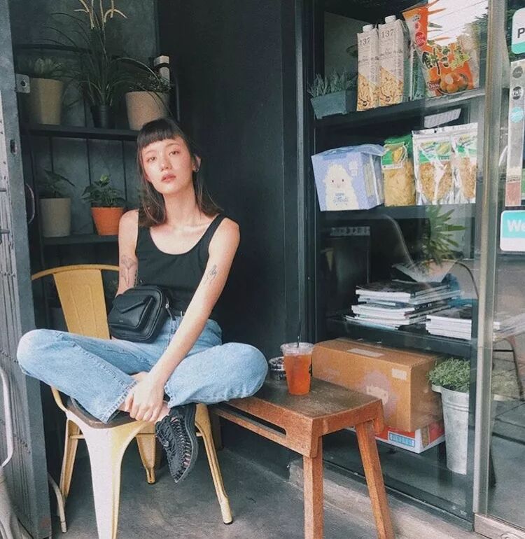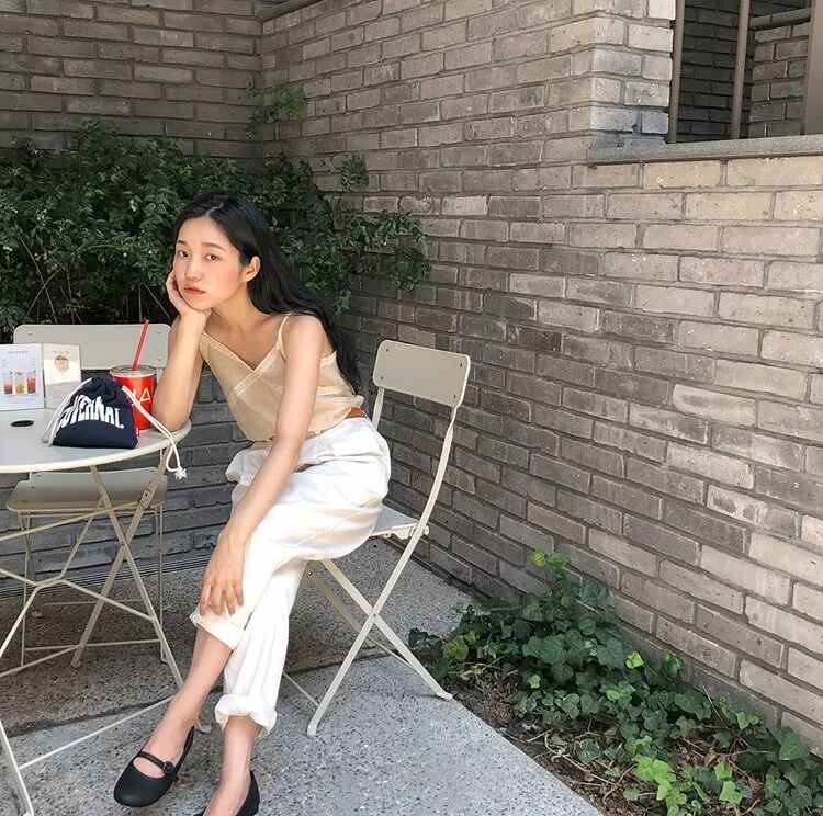 緊身牛仔褲對姑娘的腿型要求比較高,腿粗、腿型不直的姑娘建議選擇牛仔可闊腿褲 + 吊帶上衣 或者 牛仔直筒褲 + 吊帶上衣。