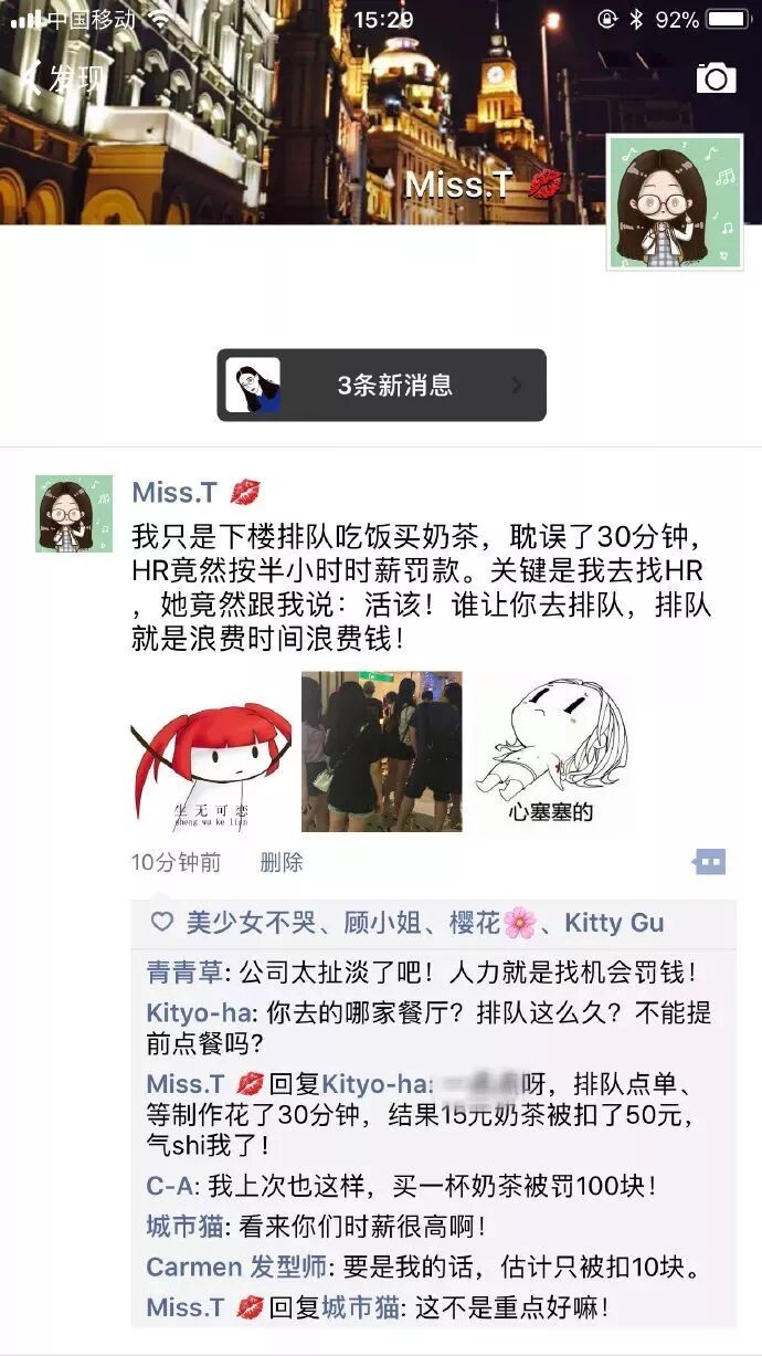 比如最近一位朋友圈吐槽公司HR,自己只是買個奶茶遲到了半小時,HR就要扣半小時時薪。