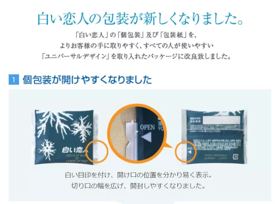 另外,現在販售的白色戀人的內獨立小包包裝開口處印有白色三角箭頭,外包裝名稱處有北海道地圖,數量及原材料有英文表記、還有二維碼、小圖標表示過敏源和儲存溫度等。