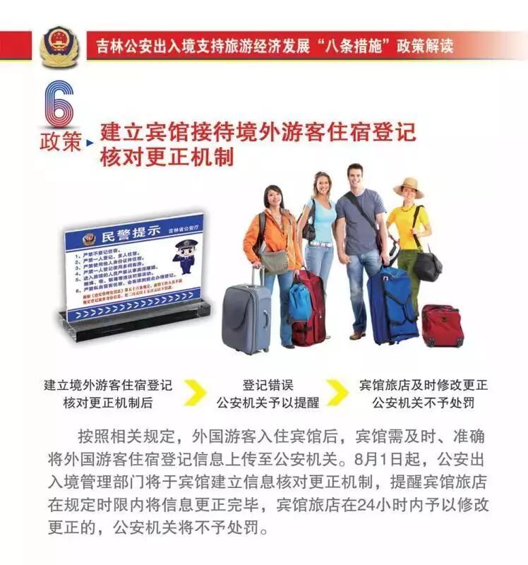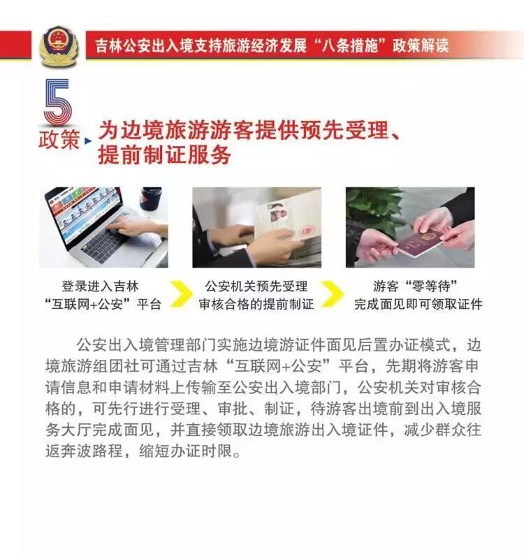 為進一步推進「放管服」改革,加快推進綠色生態旅遊大省建設,為吉林省旅遊業發展和到吉境內外遊客創造最優質的出入境環境,吉林省公安廳會同省旅發委圍繞不斷優化出入境政策和窗口服務,出台了吉林公安出入境支持旅遊經濟發展「八條措施」,從8月1日起全面實施。