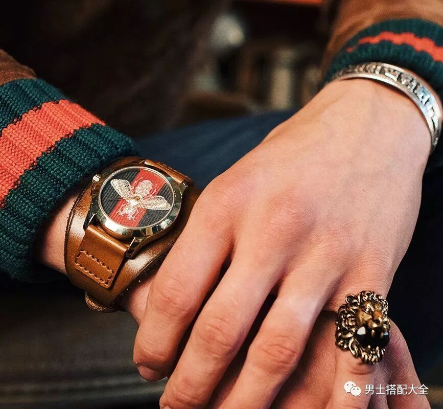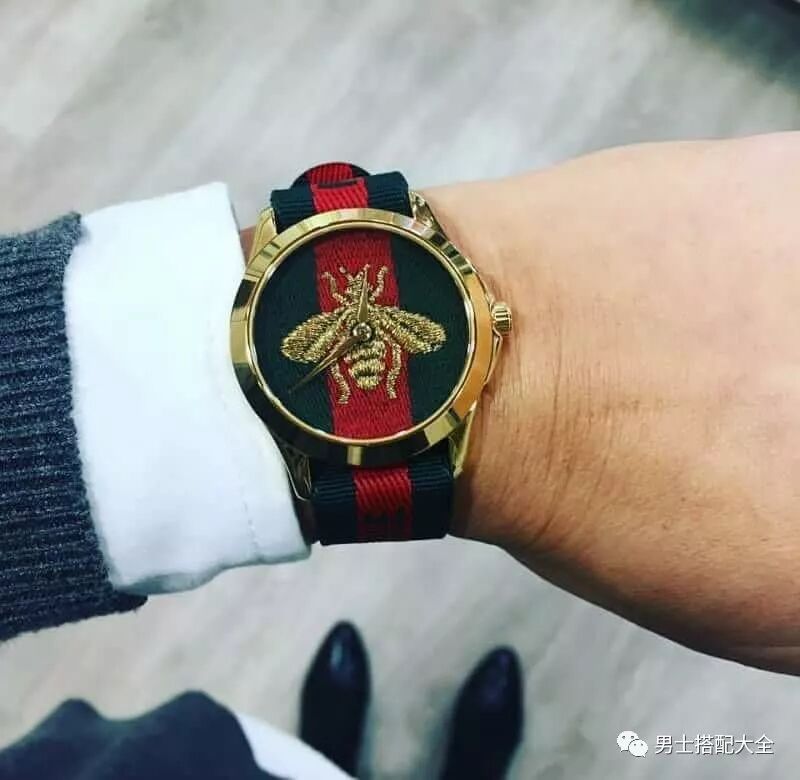 別以為 Gucci 在近幾年只有服飾系列和球鞋出盡風頭,其包款和配件也是表現得非常出彩,而表款方面絕對就屬 G-timeless 相當受到關注。這支 G-timeless 以黑色為基調,在表面和表帶都有著品牌標誌性的紅綠條紋貫穿其中,在外圈方面配以低調奢華的銀色,在表面上還有著 Gucci 的logo 及經典的蜜蜂圖騰,而表帶則運用了皮革材質,整支表在低調中帶有華麗的小細節,同時不失質感,絕對是此生必收的表款之一!