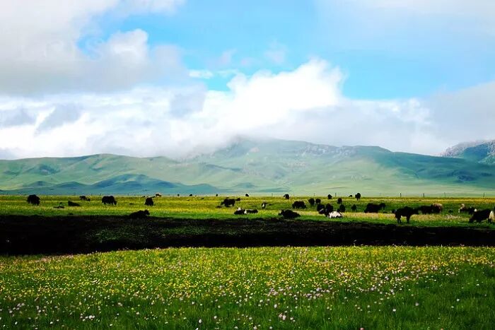 窗邊凝望,看牛羊近在眼前,一閃而過,雲層厚厚軟軟像一大片白色的棉花糖,距離在地面很近的位置,伸手就可以夠到,這樣的風景在進藏的火車上似曾相識,再一次遇見卻依然止不住感動。