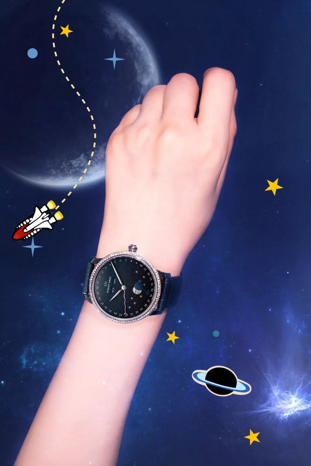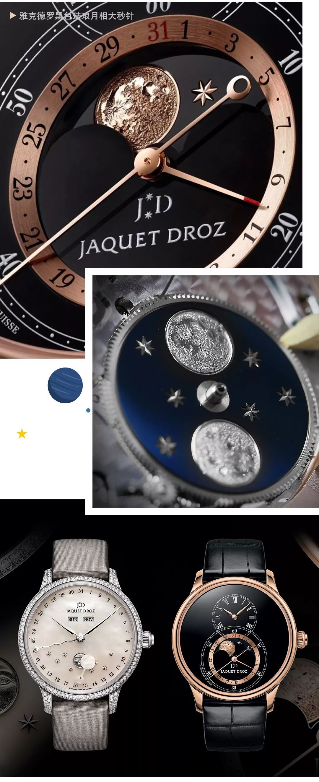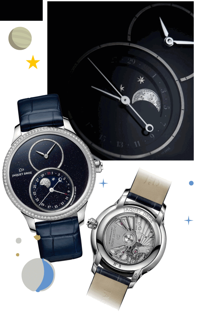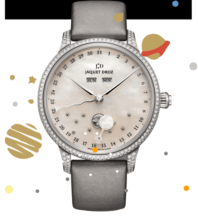 因散發光芒的太陽,為月亮帶來了盈虧並富於變化,「月相」一詞應運而生。雅克德羅表盤的布局設計以簡潔取勝,月相款亦是如此。其月相顯示大致分為兩種,一則以移動的圓盤遮擋一個固定的月亮,露出部分便為月相;另則以旋轉的月亮盤搭配鏤空盤面,可見的月亮形態,便為月相。