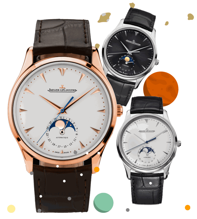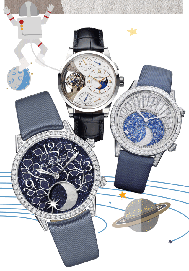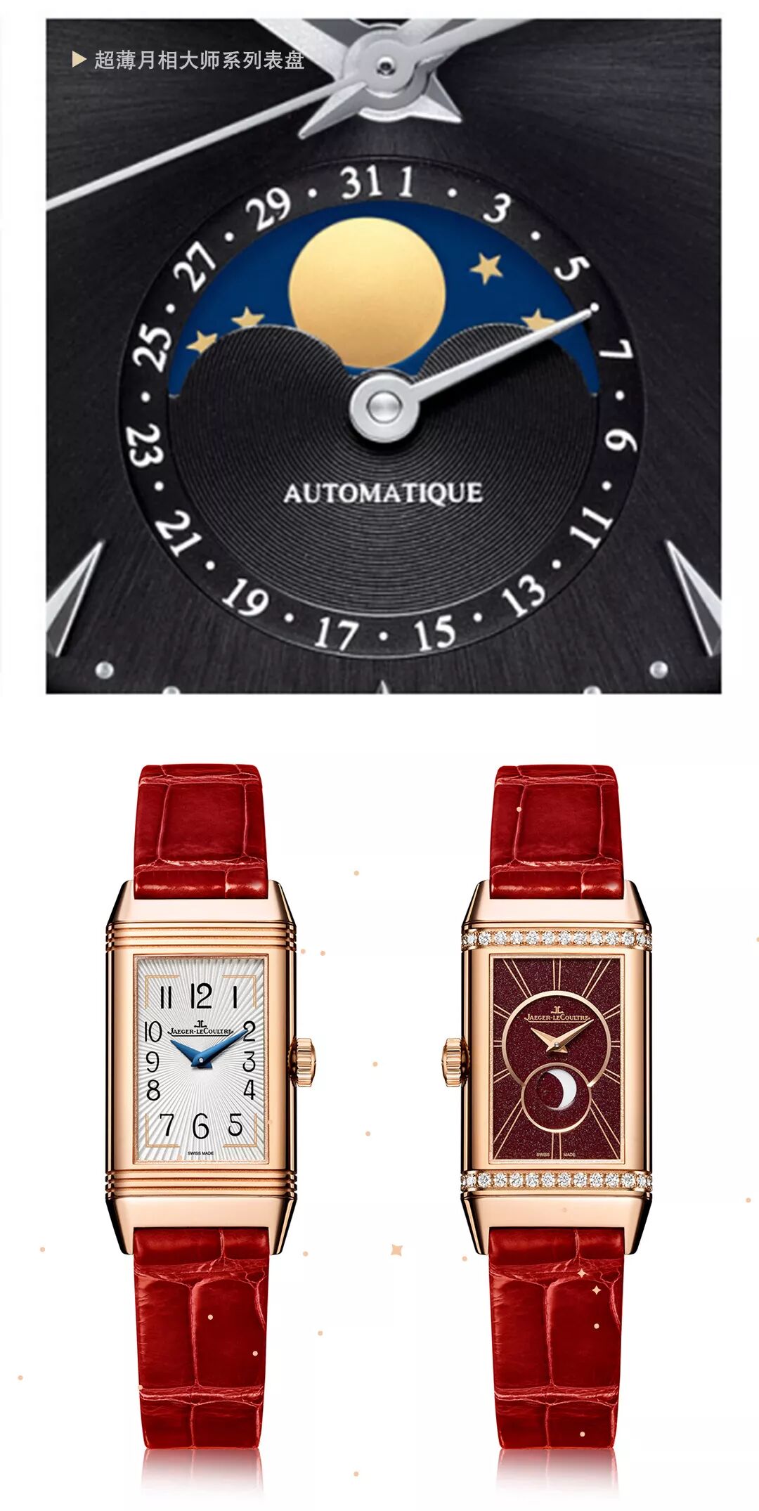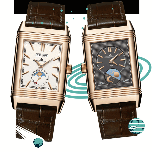 超薄月相大師系列和Reverso One系列腕表的月相功能的顯示方式都較為簡約,也是月相顯示功能中極具代表性的。其中翻轉雙面表盤設計,將腕表在時分顯示和星空月相間自由轉換,構成優美之作。