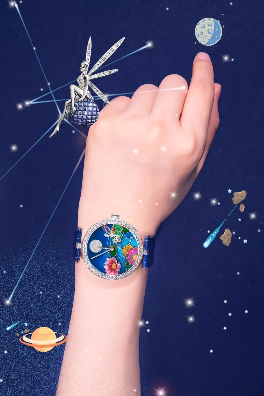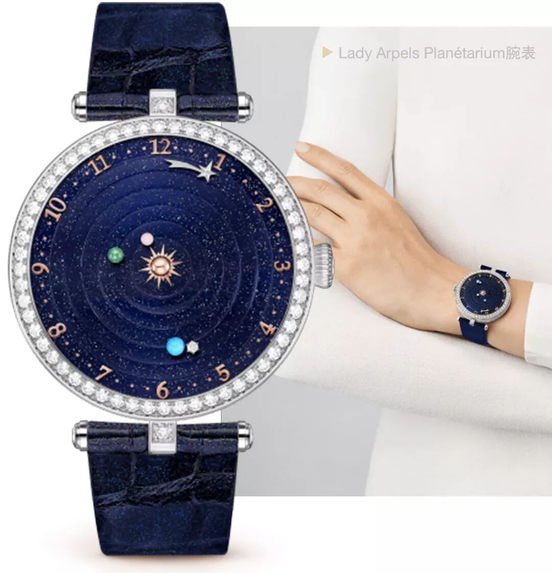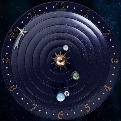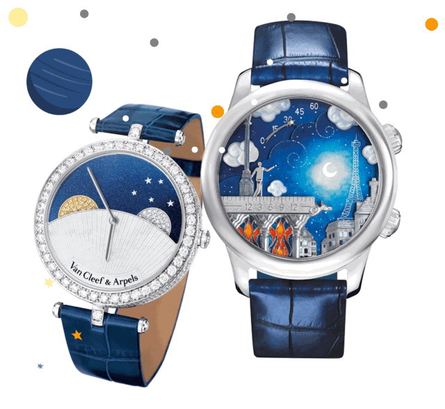 Lady Arpels Planétarium腕表把太陽和鄰近行星,包括水星、金星、地球及其天然衛星月球活現眼前。Lady Arpels Day and Night腕表表盤以24小時為周期自轉,隨著夜幕降臨,一輪明月和繁星從砂金石表盤悄然升起,太陽與月亮互相追逐,卻無法相見,宇宙的深邃奧秘藏於表盤每日的流轉中。