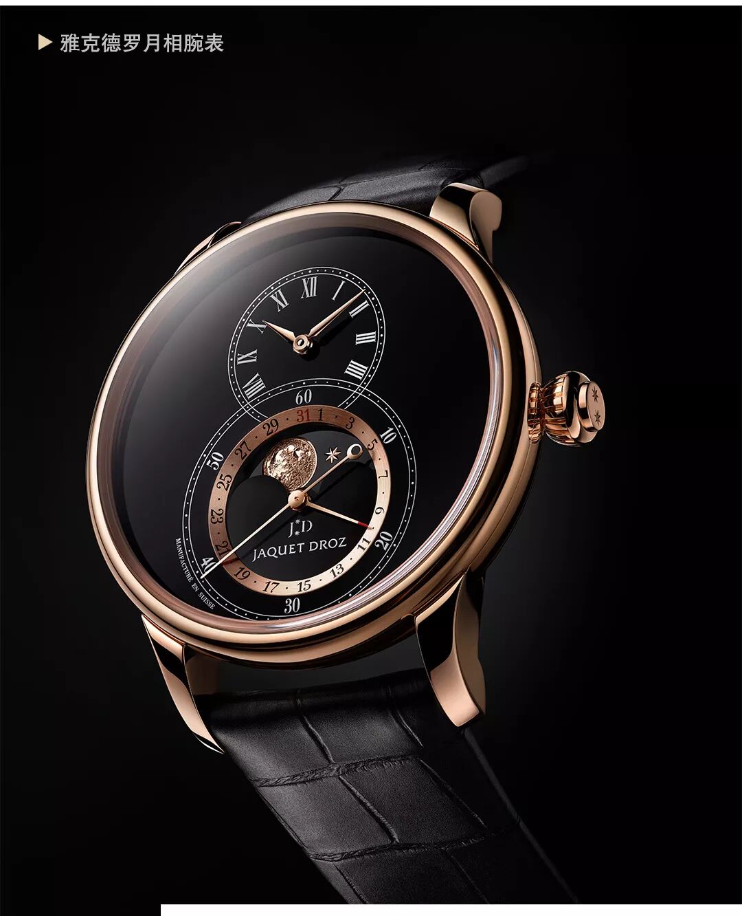而黑色琺瑯月相大秒針腕表的越想呈現方式則不同,一輪明月從雙層表盤慢慢掠過,呈現了從新月到下玄月的月相周期。