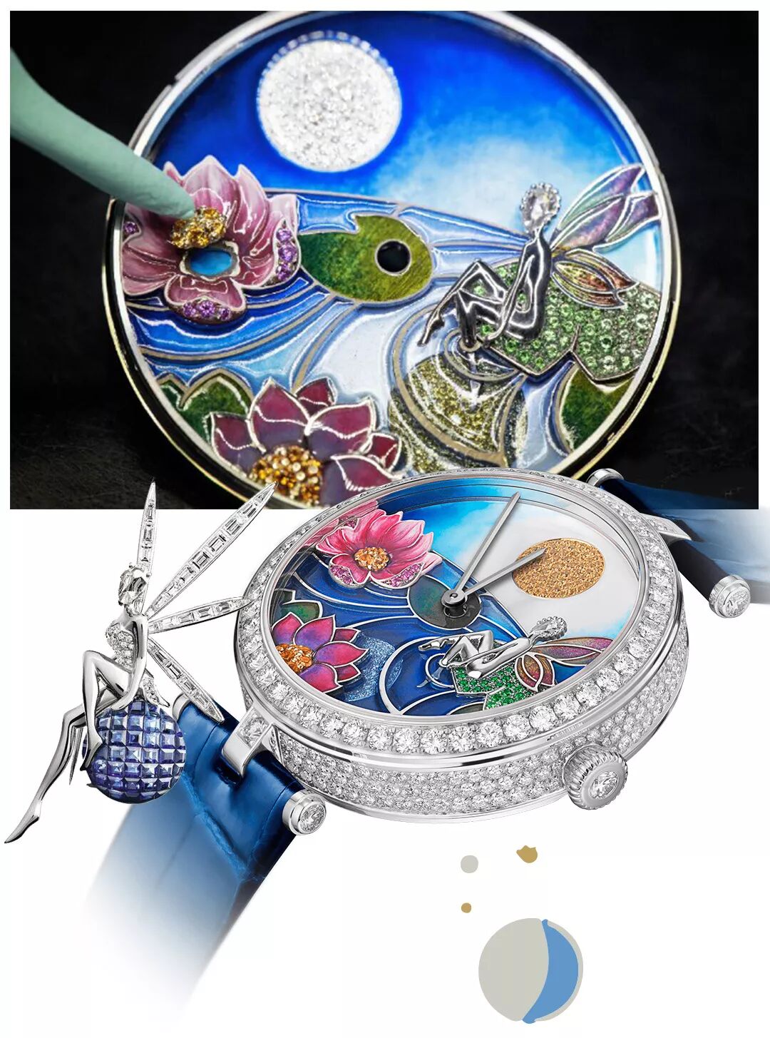 另外,Lady Arpels Jour Nuit Fee Ondin腕表同樣擁有24小時模塊,日夜變換顯示於表盤之上。每當皎潔滿月升起,便意味著夜幕降臨。這枚腕表採用了梵克雅寶標誌性的「凌波仙子」元素,表盤展現了荷塘月色般的美好景象。