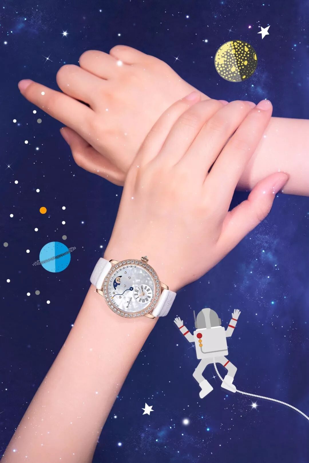 當然,在雅克德羅的月相女表中不乏「月色朦朧」的表款。這枚珍珠母貝月相腕表的整個表盤宛若點綴8顆星星的蒼穹美景,6時位置一輪金月隨著白色珍珠母貝掩映的開合綻露月容。月亮或隱或現、明暗交迭直至完全隱沒。