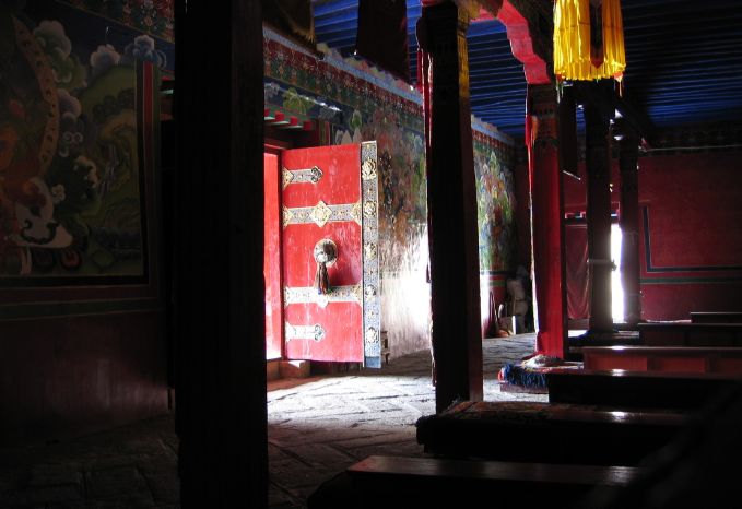 9、色拉寺許多大殿內保存了較老的壁畫,辯經在寺內最北邊的辯經場舉行,觀看辯經的人非常多,早到可以占個好位置。