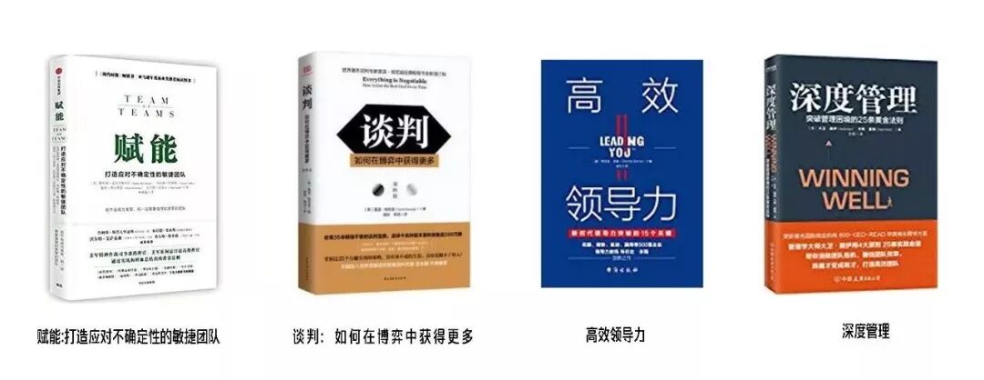 (從左至右依次是《賦能:打造應對不確定性的敏捷團隊》、《談判:如何在博弈中獲得更多》、《高效主管力》、《深度管理》。)
