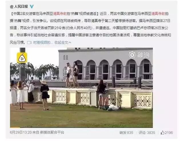 我以兩件今年發生在馬來西亞的事件為例。在馬來西亞沙巴州的首府亞庇,有個很有名的景點叫做「水上清真寺」,前不久有兩位自稱是舞蹈教師的中國遊客,在清真寺前的圍牆上大跳熱舞,根據舞蹈風格來看,可能是在拍攝抖音短視頻,結果當然是她們被清真寺里的管理人員驅趕。