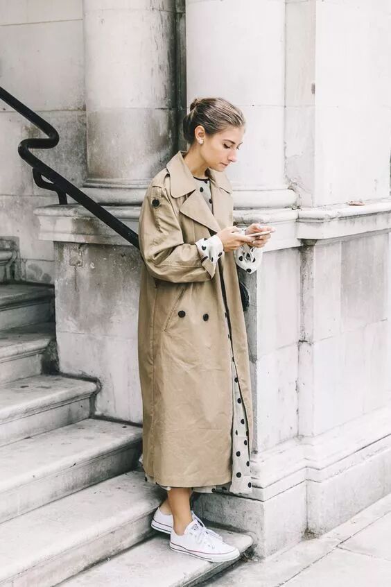 還可以穿上比風衣更長的裙子或者闊腿褲,慵懶也多了一分:
