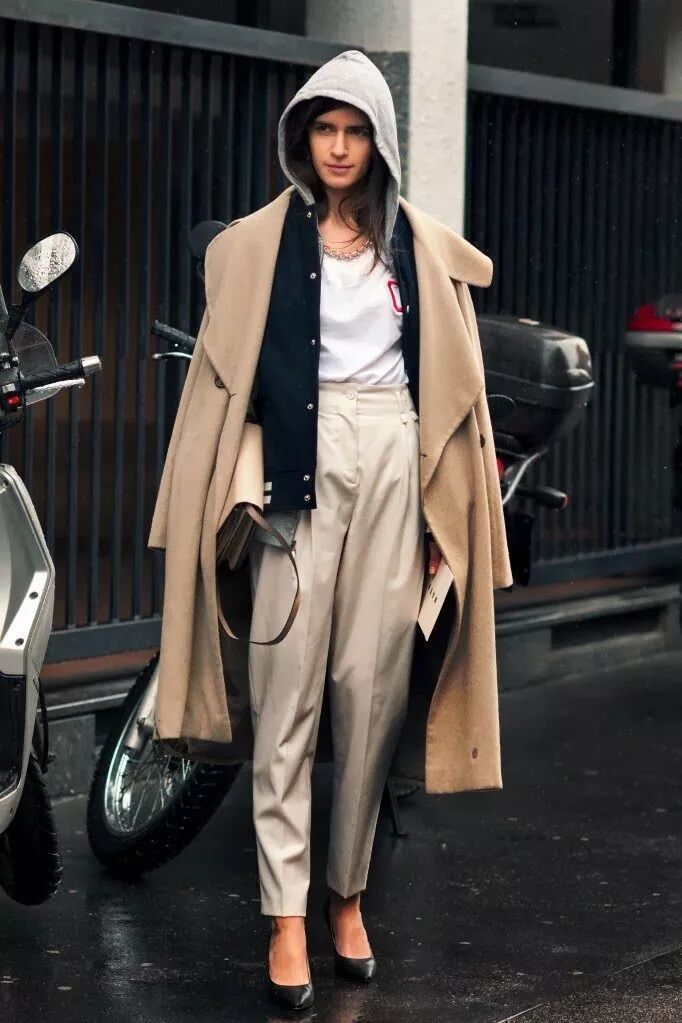如果想要調和一下風衣的成熟感,在里面加 hoodie 就可以。這個方法對大衣同樣適用: