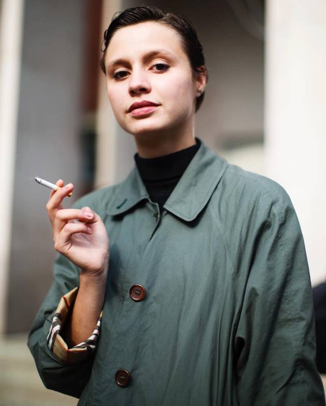 「早上起床後,頭髮沒有好好梳,就隨意地在睡衣上套一件風衣,系上腰帶去買麵包和紙,然後銜著一支煙。」