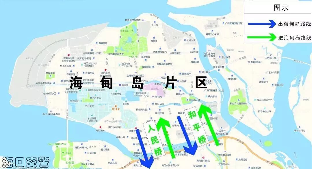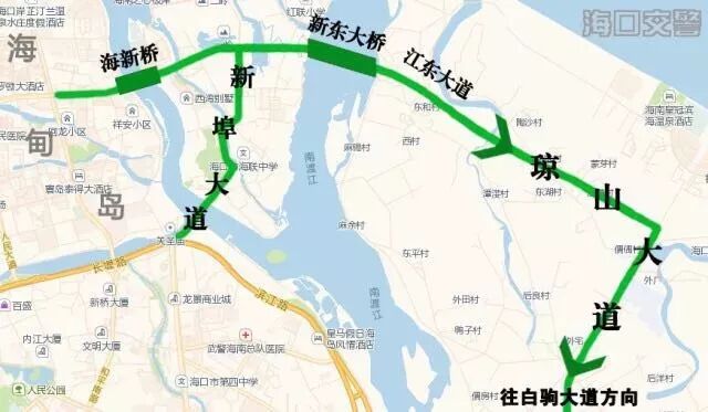 1、國興大道、瓊州大橋北片區駕駛人可取道海甸島、新東大橋往東行駛前往瓊山大道或白駒大道進出城。