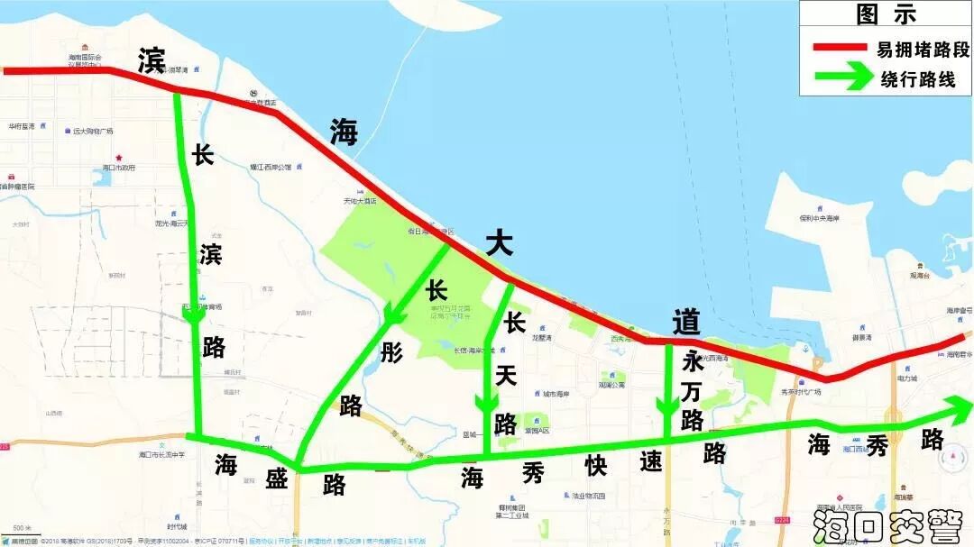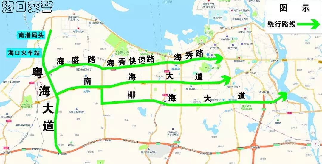 2、國興大道、瓊州大橋南片區駕駛人可取道椰海大道、海瑞大橋前往瓊山大道、白駒大道進出城。