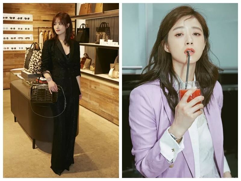 ▲同樣沉迷經典西裝的還有成功瘦身好幾圈的「華妃」蔣欣。All black吸煙裝神秘幹練,薰衣草紫打破正式。一酷一美剛柔並濟,玩轉色彩。