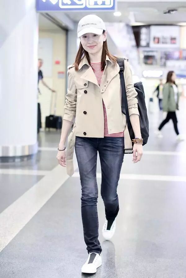 董潔在機場的穿搭比較隨性,不過她這樣打扮倒是很會揚長避短,穿白色T恤衫搭緊身牛仔褲,襯得她腿好修長呢。