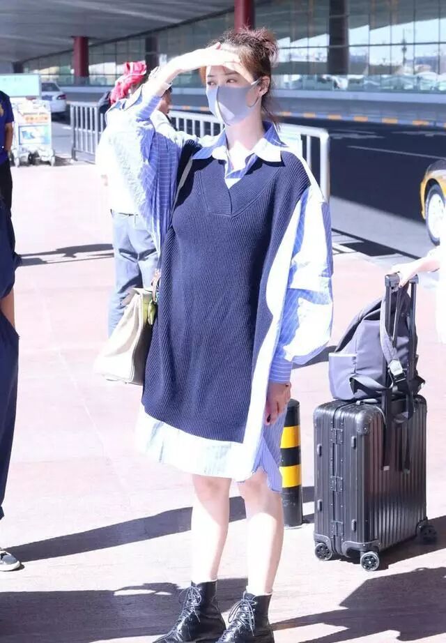 蔣欣在機場穿了當下很流行的條紋長袖襯衫,針織衫與條紋襯衫款式的拼接,看起來時髦極了,只不過如此款式的款式,穿的她看起來更加胖了,不過她穿的很自信。