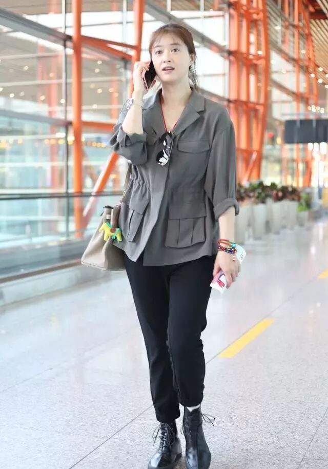 其實她的穿搭一直都很接地氣的,深灰色的工裝上衣搭條黑色休閒褲,這種黑灰色的顏色搭配倒是蠻經典的,腳上踩一雙黑色的短靴,時尚中帶著一絲隨性。
