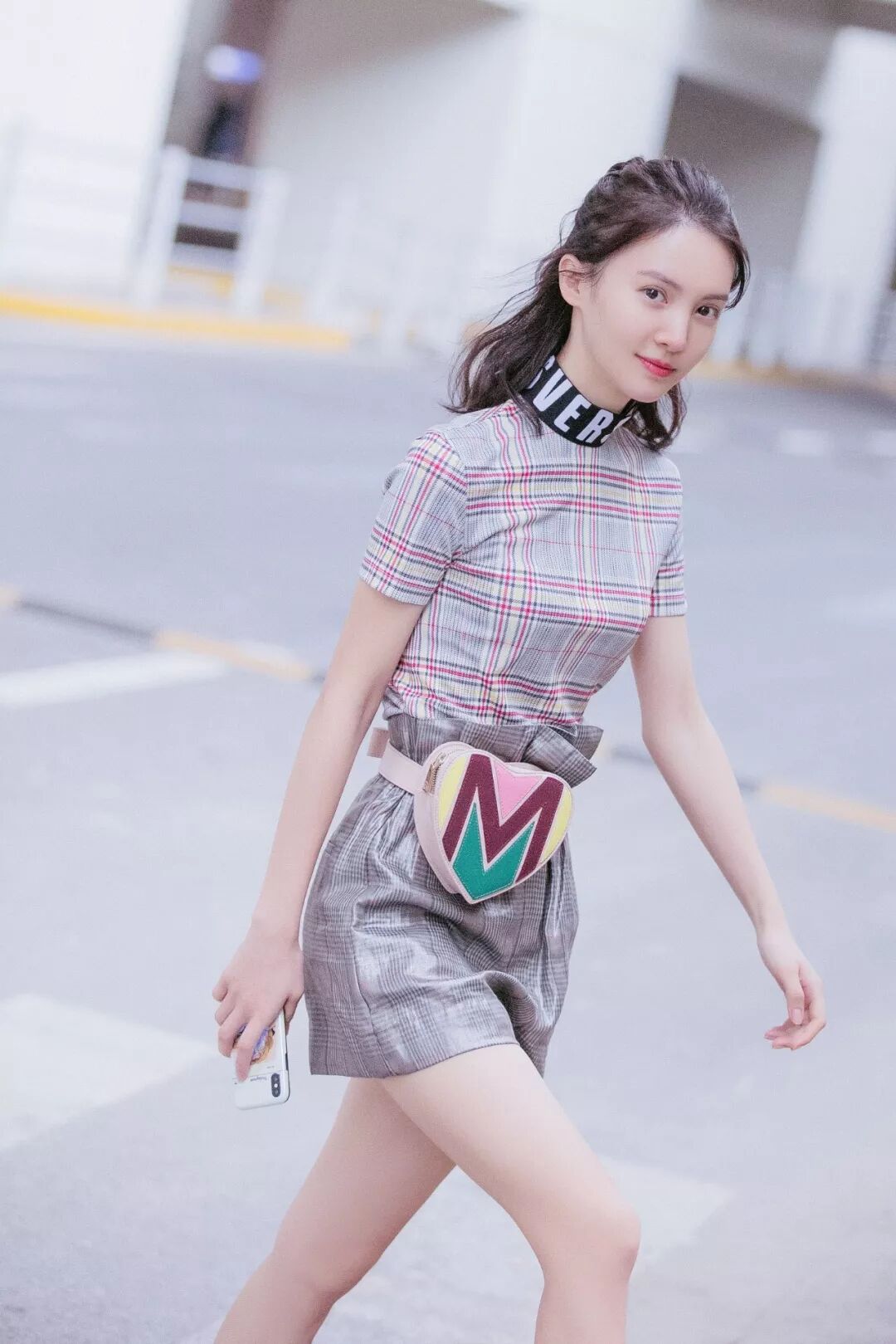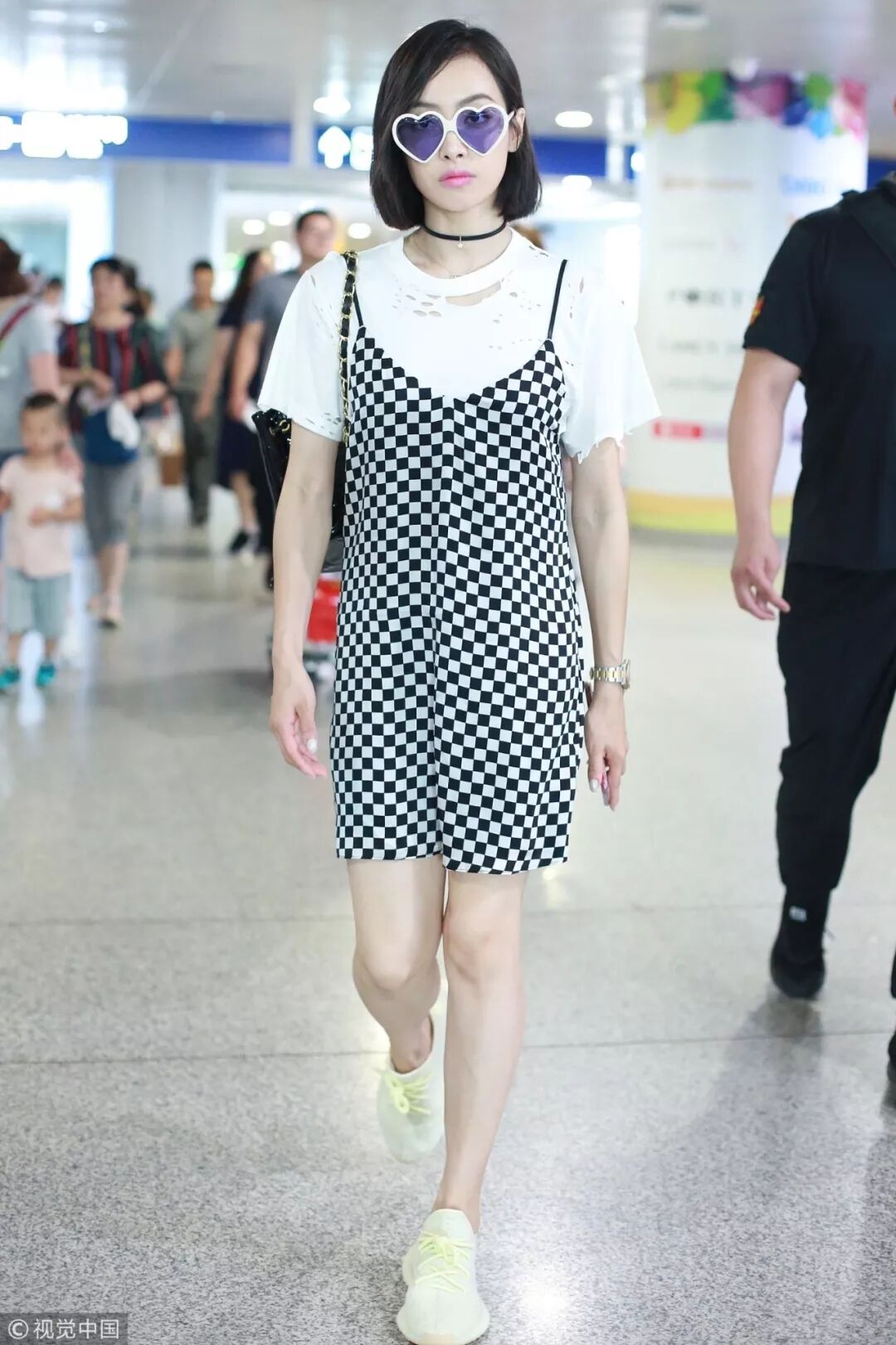 琪琪這身造型非常硬朗,幹練的條紋襯衣下搭黑色闊腿褲,卻被桃心裝飾的小白鞋不露聲色地注入少女心,帥氣又俏皮。