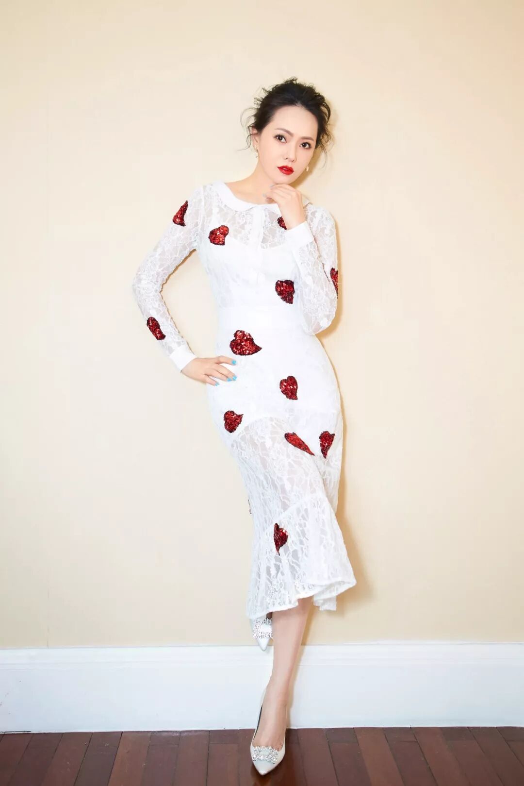 伊能靜這條連衣裙就知道了,白色透視蕾絲裙混入亮片桃心,腳踩Roger Vivier鑽飾方扣白色緞面高跟鞋,典雅的造型透著少女氣息。