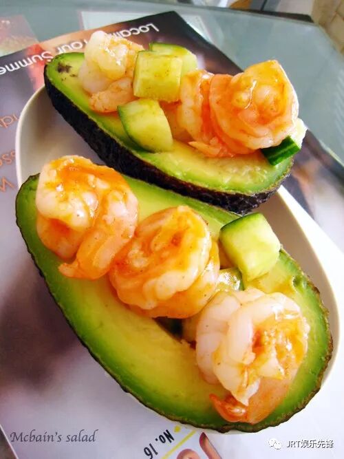 做法 : 先將蝦仁焯熟,黃瓜切丁;再將牛油果洗淨,果肉切丁;接著將牛油果,蝦仁,黃瓜丁加入沙拉醬調味;最後另取一只牛油果,去顆,把蝦仁沙拉填入。
