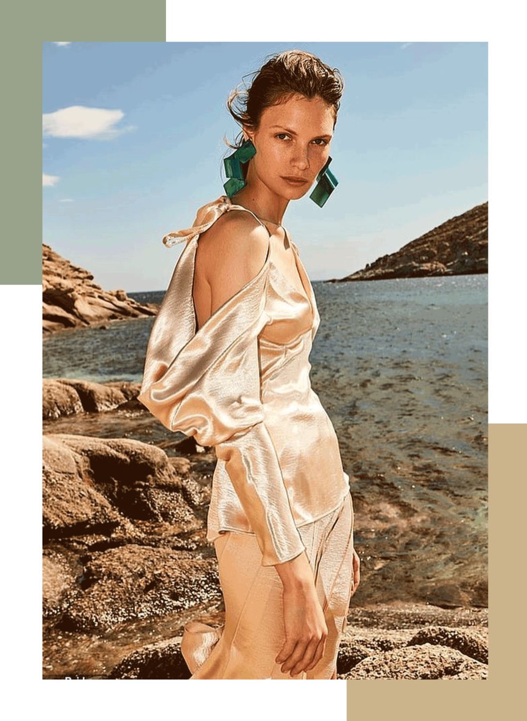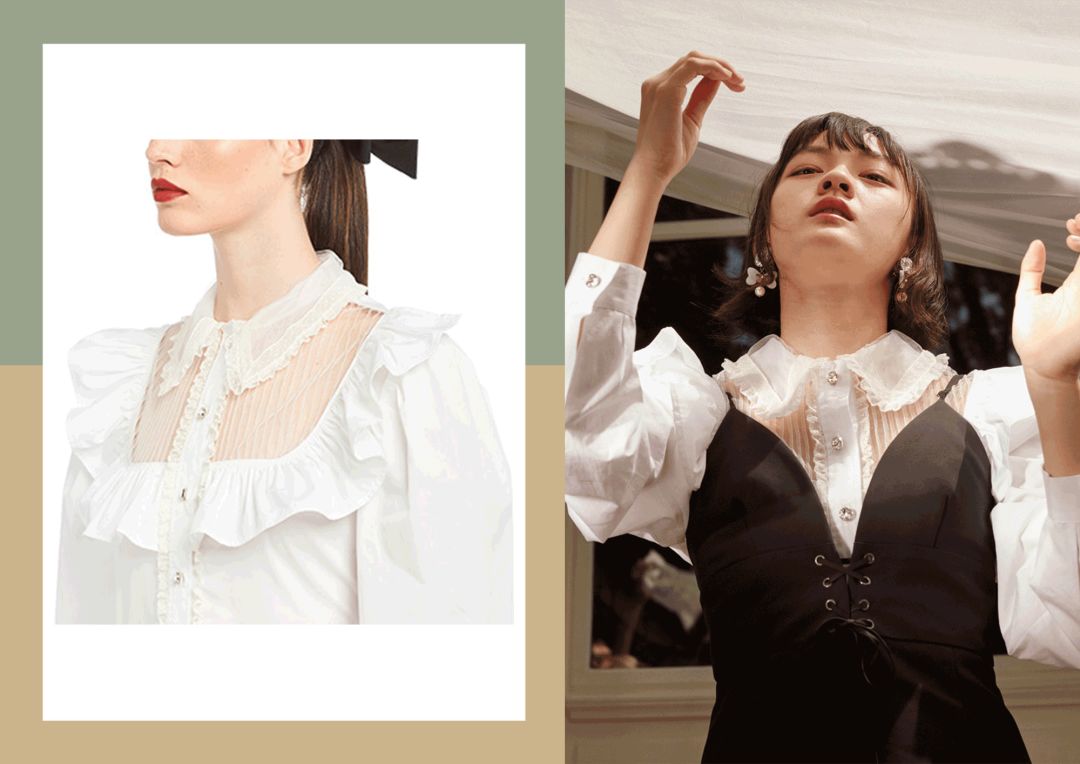 她的牌子出了好多這種宮廷感的單品,這件襯衣還帶著貝殼感光澤。
