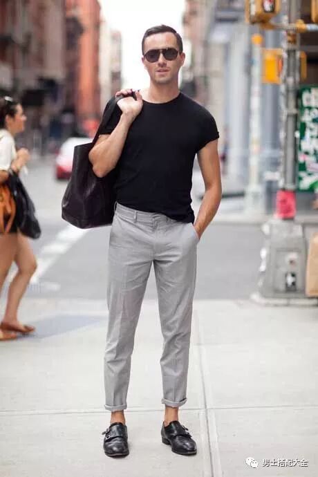 就連只穿一件黑色T-Shirt以及灰色西裝褲,雙扣孟克鞋也能在這極簡造型中融入的如此得宜,卷起褲管添加更多個人隨性感。