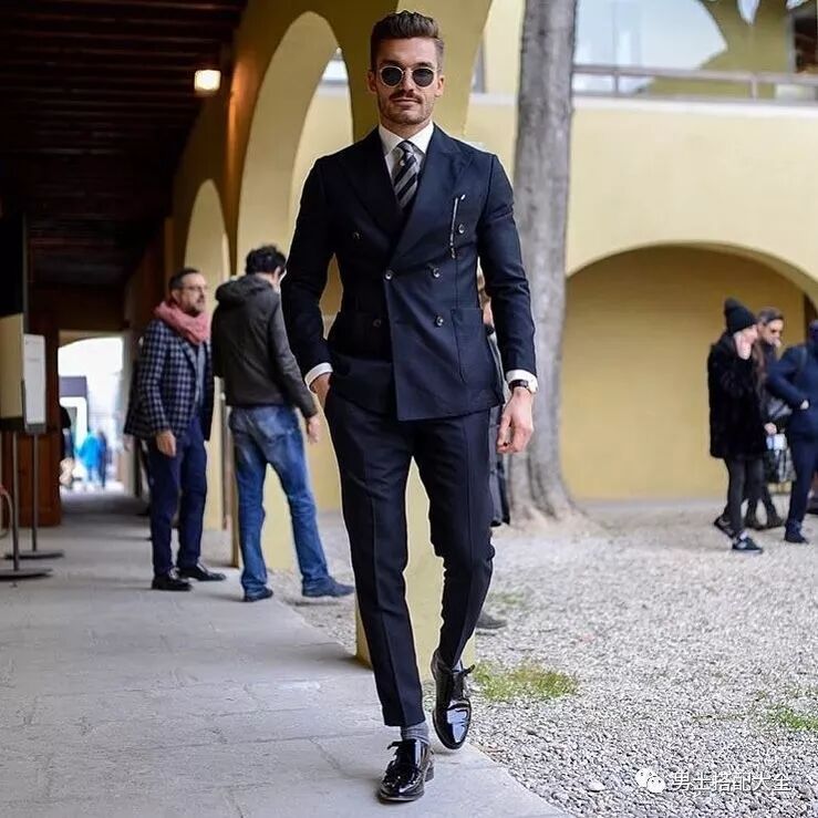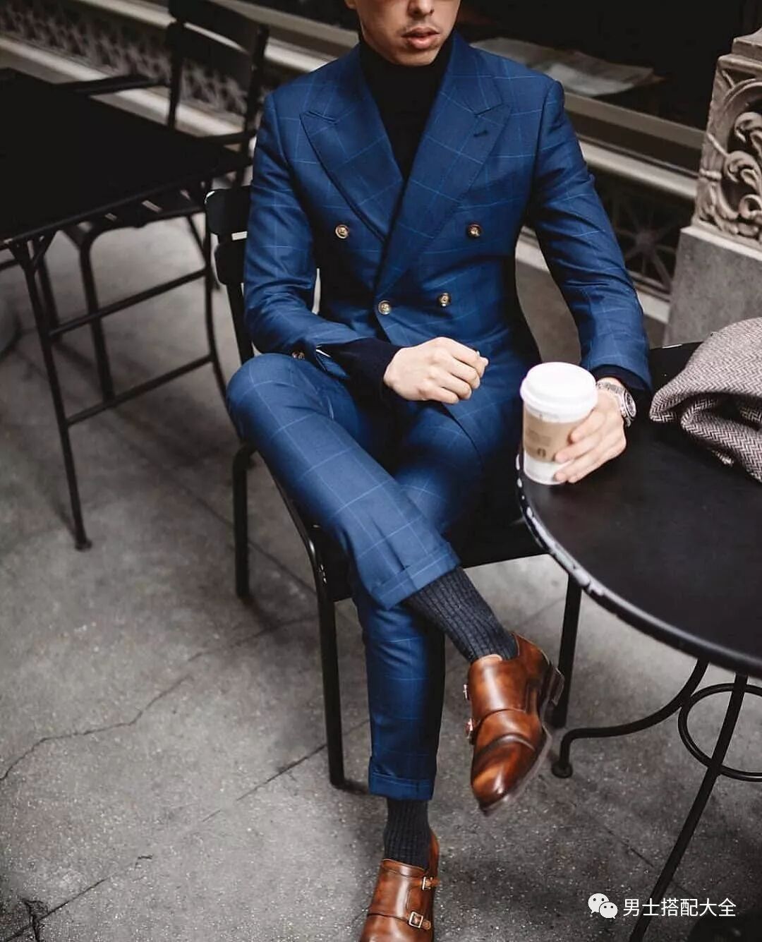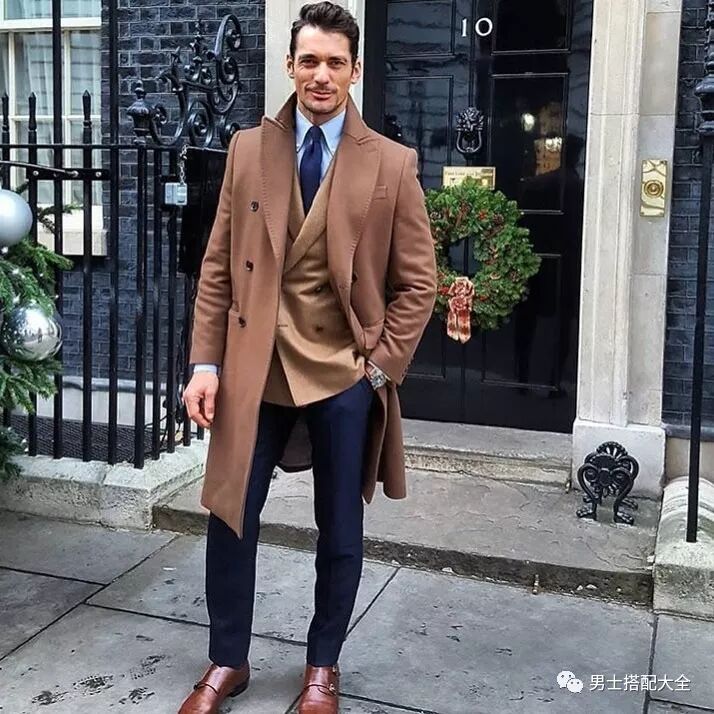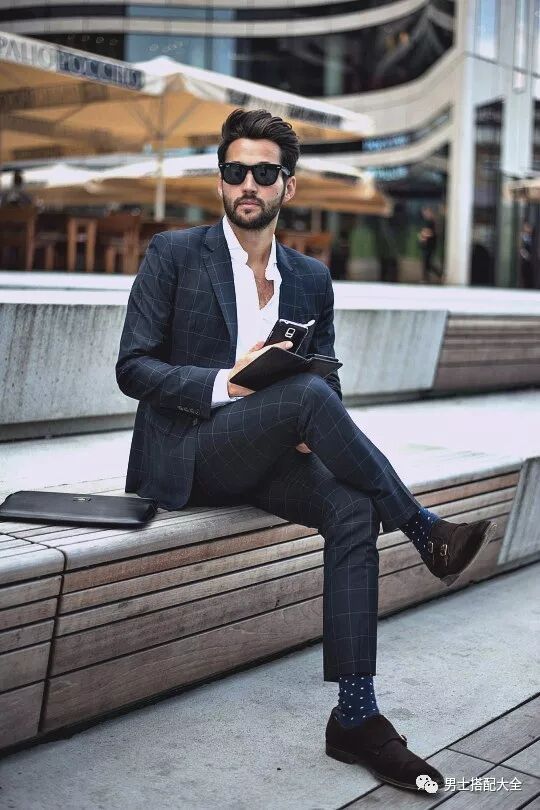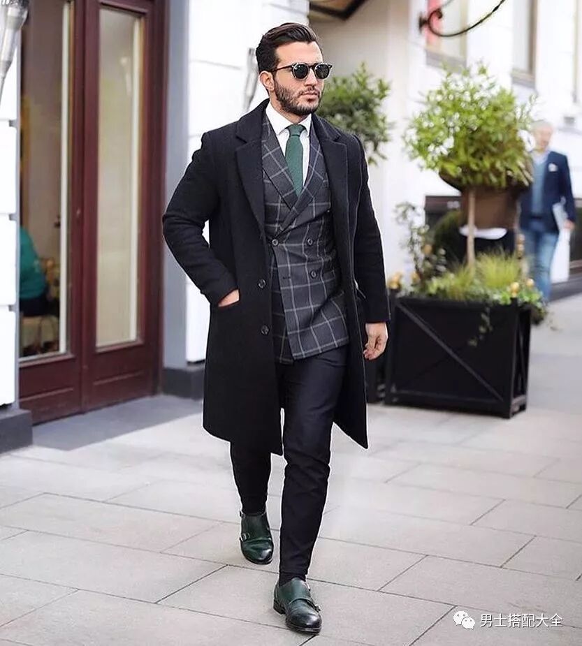 黑色大衣搭配格紋雙排扣西裝,再選擇一雙墨綠色孟克鞋,實在是「騷」氣十足呀!
