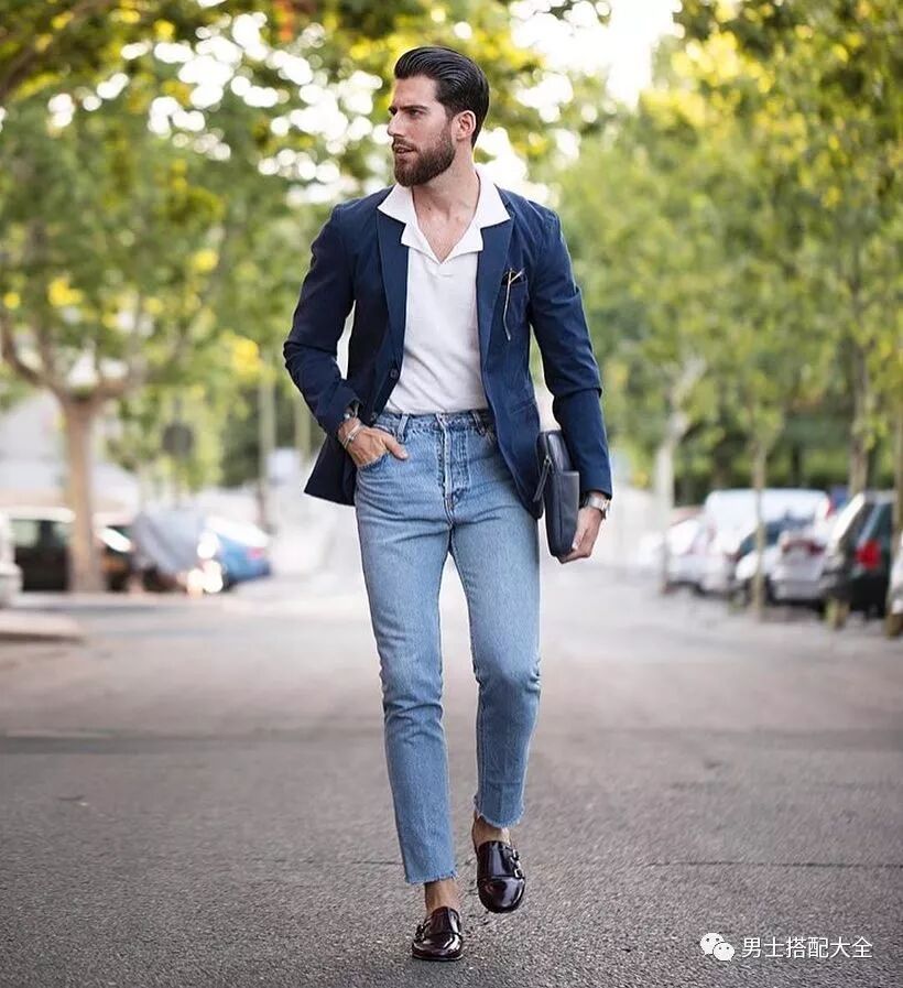 優雅的海軍藍西裝配上淺色牛仔褲、雙扣孟克鞋,利用一系列的撞色搭配營造出在不搭調中的和諧,可以說是配色穿搭高手中的高手!