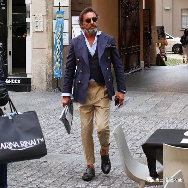 搶眼的深藍色西裝配上卡其色褲子,細節中就看出不平凡,深黑咖啡雙扣孟克鞋與馬甲的色系互相呼應,胸前的口袋巾更是有畫龍點睛之妙!