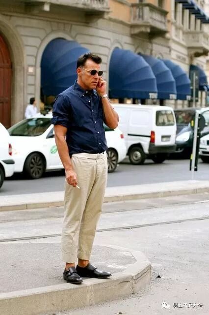 簡約的深藍色襯衫配上舒適的亞麻寬褲,悠哉的漫步在都市街頭,踩著一雙經典款雙扣黑孟克鞋,整個人都默默的時尚起來了!