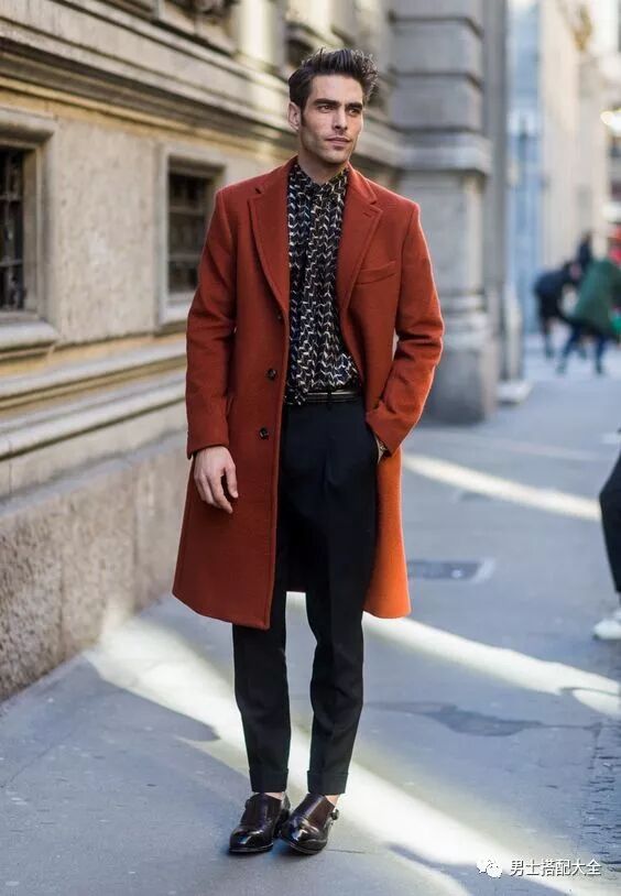 亮色大衣的高調穿法,內搭的花紋襯衫全扣,配上瀟灑的休閒西褲,沒想到咖啡色雙扣孟克鞋也能這樣搭配!想讓這套穿搭再更酷帥一點的型男,換上黑色孟克鞋也完全OK!