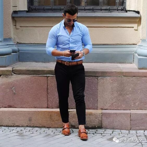 湖藍色襯衫配上深藍色合身窄管西裝褲,淺駝色皮帶點出腰線,讓視覺的身材比例更好,棕色經典雙扣孟克鞋完成你的整身質感!