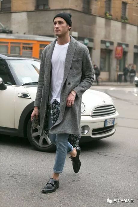 超舒適的休閒長板灰針織版型外套配上白T、卷褲管牛仔褲,腰間上在綁一條格紋襯衫營造出隨性街頭風格,這種隨性Style配上黑色雙扣孟克鞋也完全不違和