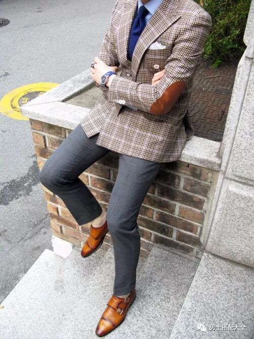 趣味、時尚兼具的拼接塊格紋西裝外套與腳上的孟克皮鞋互相呼應搭配色系,然後撇開同款的西裝褲,選擇下著深灰色的合身西裝褲,小撞色的技巧搭配,讓你輕鬆成為率性又帶點俏皮的時尚街拍紳士!