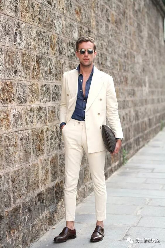 淡黃色的西裝外套成為視覺的主要焦點,襯衫及雙扣孟克鞋則是以不同色系的交織出的欽點配備,最後再拎一個簡約的黑色皮包。想完成高質感的熟男打扮,你只需要合身的西裝以及一雙能穿上場面的鞋!