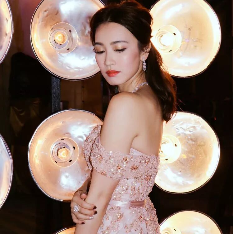 這套藍色的一字肩連身裙,則配上較休閒的高丸子頭,顯得俐落時尚之餘又不會太老成;妝容方面,偏粉紅調的唇色就令她顯得好氣色。